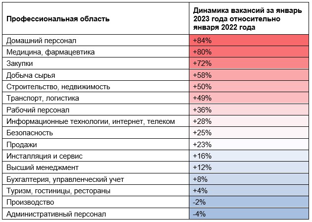 Количество активных вакансий наиболее заметно выросло в профессиональных сферах «Домашний персонал» (сразу +84% к прошлому году), «Медицина, фармацевтика» (+80%), «Закупки» (+72%), «Добыча сырья» (+58%) и «Строительство, недвижимость» (+50%).