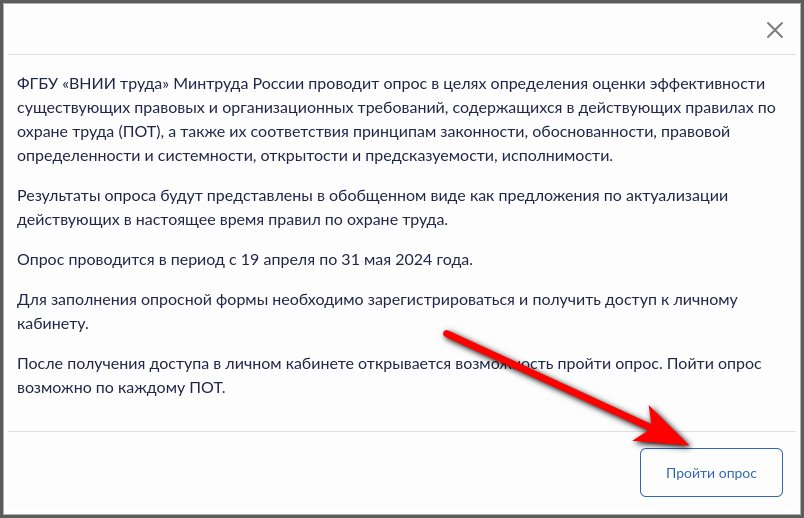 Министерство труда и социальной защиты Российской Федерации информирует, что в период с 24 апреля по 31 мая 2024 года на Электронной платформе по охране труда ( https://safe.vcot.info ) проводится опрос об оценке содержания требований действующих правил по охране труда, и просит организовать работу по участию работодателей в указанном опросе.