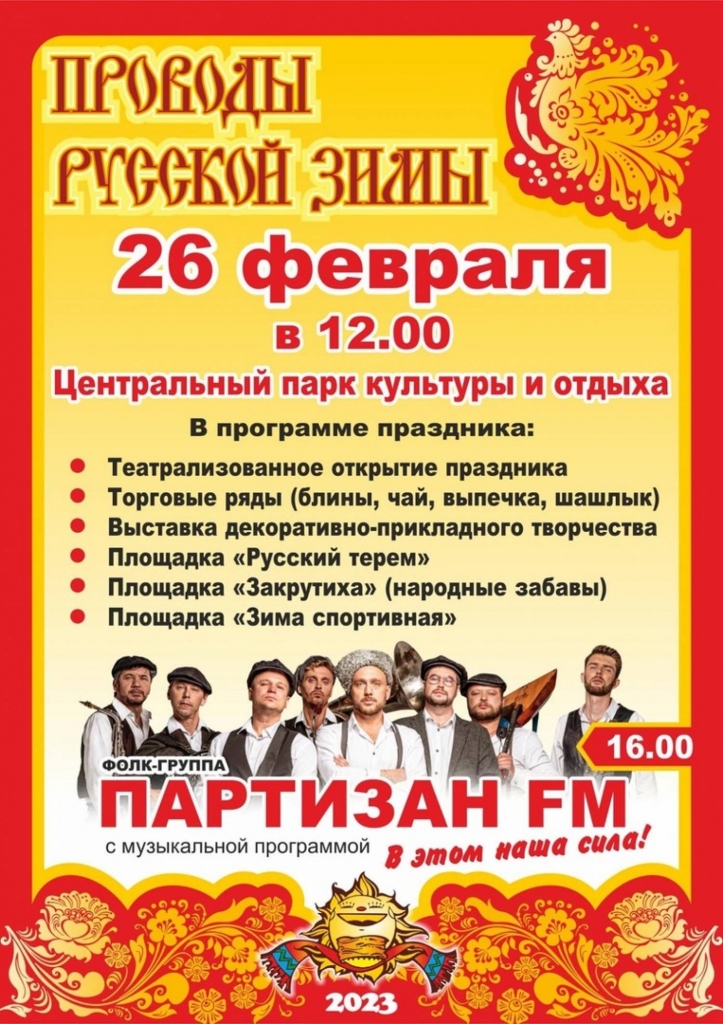 Завтра, 26 февраля – в последний день Масленицы, в ЦПКиО состоится большой праздник «Проводы русской зимы», на котором курганцев ждут концертно-развлекательная программа, масленичный хоровод, розыгрыш главного приза - барана, сожжение чучела Масленицы. Праздничным сюрпризом для курганцев и гостей города станет концерт московской фолк-группы «Партизан FM».