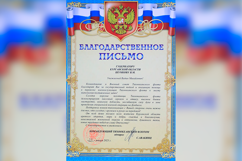 От имени Командования и Военного совета Тихоокеанского флота поблагодарил губернатора Курганской области Вадима Шумкова за оказанную регионом помощь в перевозке военнослужащих к месту выполнения поставленных задач.