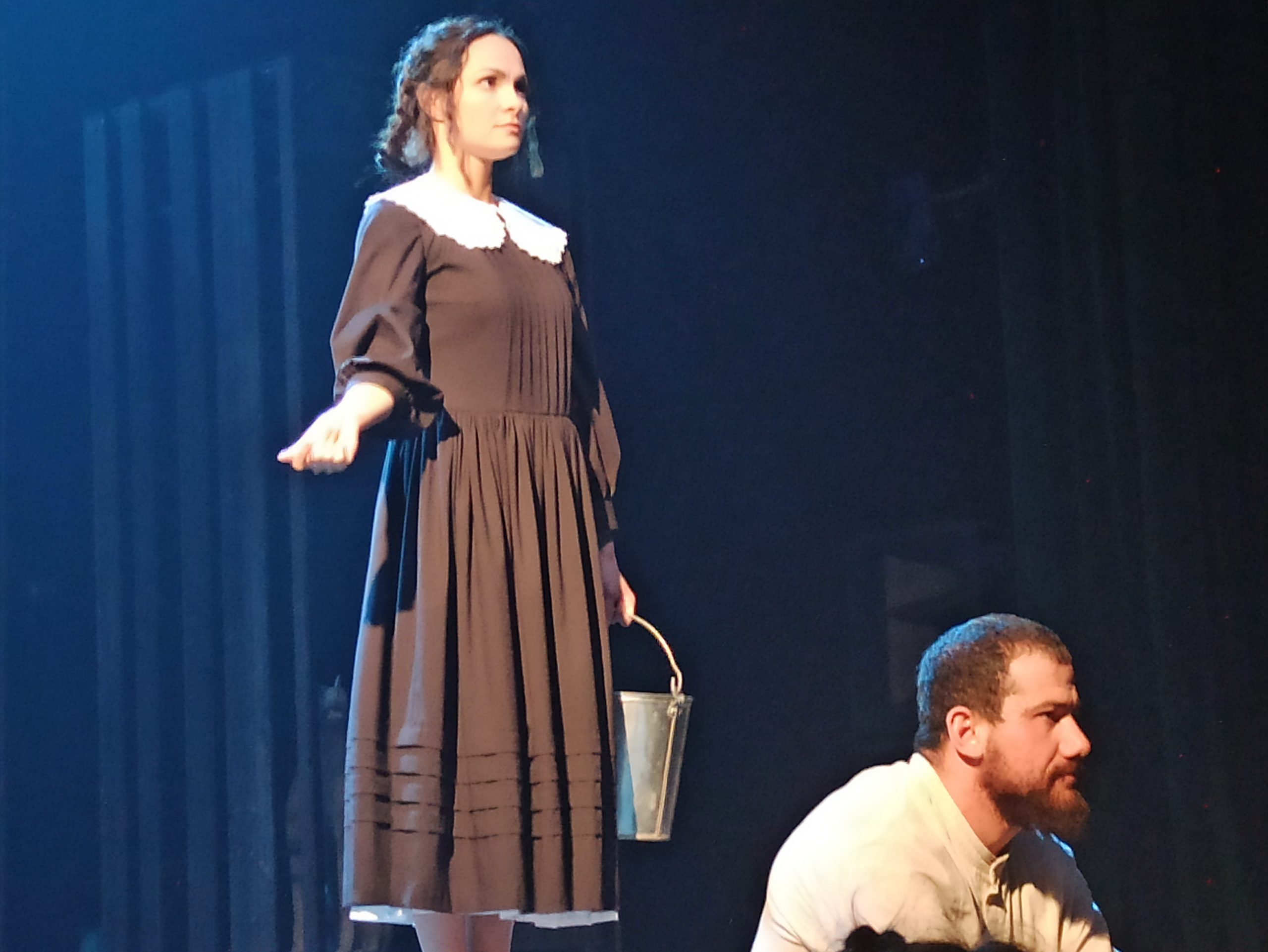 Глухонемой дворник Герасим явился к барыне и заговорил на французском. Фото Николая Волкова.В другом действии пьесы Герасим спасает тонущего в реке щенка. Тот оборачивается девицей в гимназическом платье, которую, оказывается, барыня отдала в пансион, и там простолюдинку не только учили высоким наукам, но и регулярно стегали розгами на глазах однокурсниц дворянок. И девушка воспылала такой лютой обидой на весь миропорядок — людской и божеский, что стала призывать Герасима восстать. А тот, глухонемой, опять обрел дар речи, но уже русской, и начал противиться этому тлетворному влиянию, напоминая о непреложных христианских заповедях. Однако эмоциональным репликам Му-му , оказавшейся девицей Марьей Николаевной , драматург уделил гораздо больше сценического времени. Верзила Герасим выглядел, словно дремучий балбес, оправдывающийся перед лицом просвещенной воспитанницы пансиона.