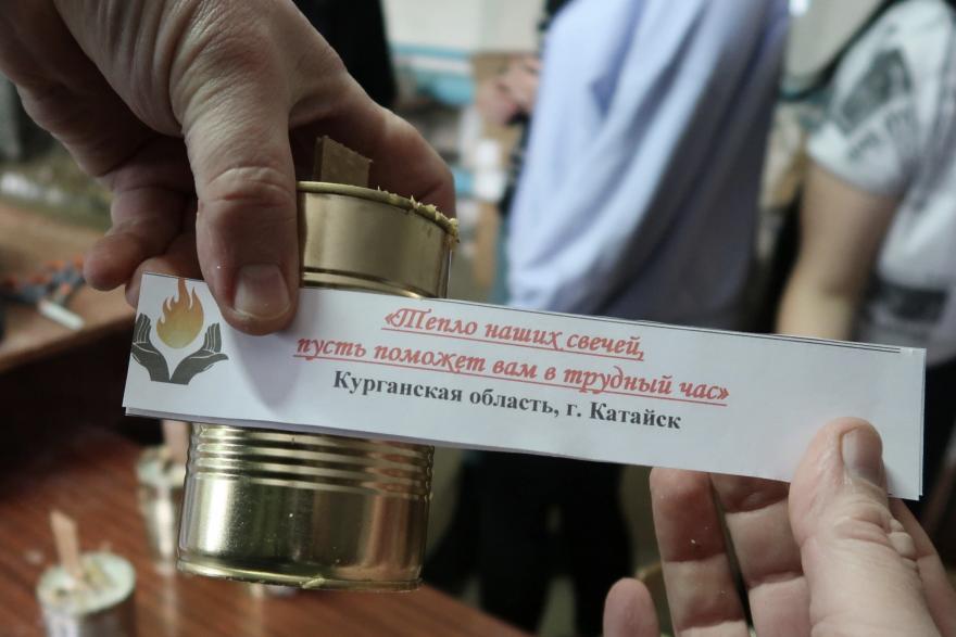 В Катайске эти свечи изготавливают в центре соцподдержки. Сотрудники делают трудоёмкую работу - топят парафин и заливают его в заготовки для свечей. Помогают и волонтеры: нарезают картон для заполнения банок, а затем крепят на каждую свечу наклейку, упаковывают всё в коробки и отправляют защитникам Родины.
