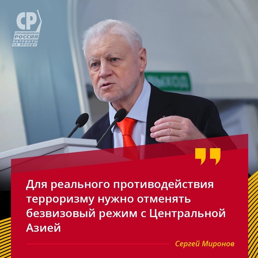 ☝ " СПРАВЕДЛИВАЯ РОССИЯ – ЗА ПРАВДУ предлагает целый комплекс мер по ужесточению контроля над миграционными процессами, но начинать нужно с введения визового режима с государствами Центральной Азии. Отмену безвиза ни в коем случае нельзя расценивать как недружественный жест в отношении наших соседей. Это послужит не только укреплению национальной безопасности, но и подлинному взаимовыгодному сотрудничеству РФ и наших южных соседей. Иначе не будет порядка на границе, который сейчас жизненно необходим, чтобы регулировать миграцию и противостоять террористическим атакам!" – уверен Сергей Миронов.