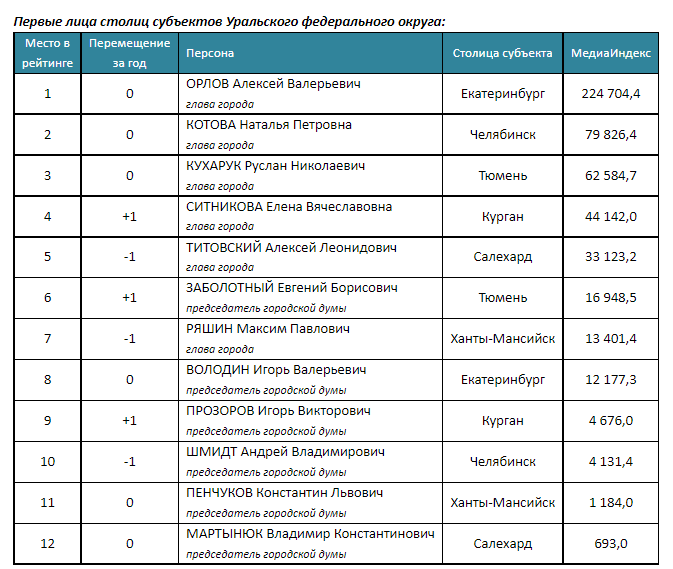 В медиарейтинг от «Медиалогии» вошли действующие главы городов и председатели городских дум Уральского федерального округа. Рейтинг с января по декабрь 2022 года учитывал качество информационного поля вокруг их персон на ТВ, радио, СМИ, интернете, журналах - какие издания, информационные порталы, в каком контексте и в каком объёме их упоминали.