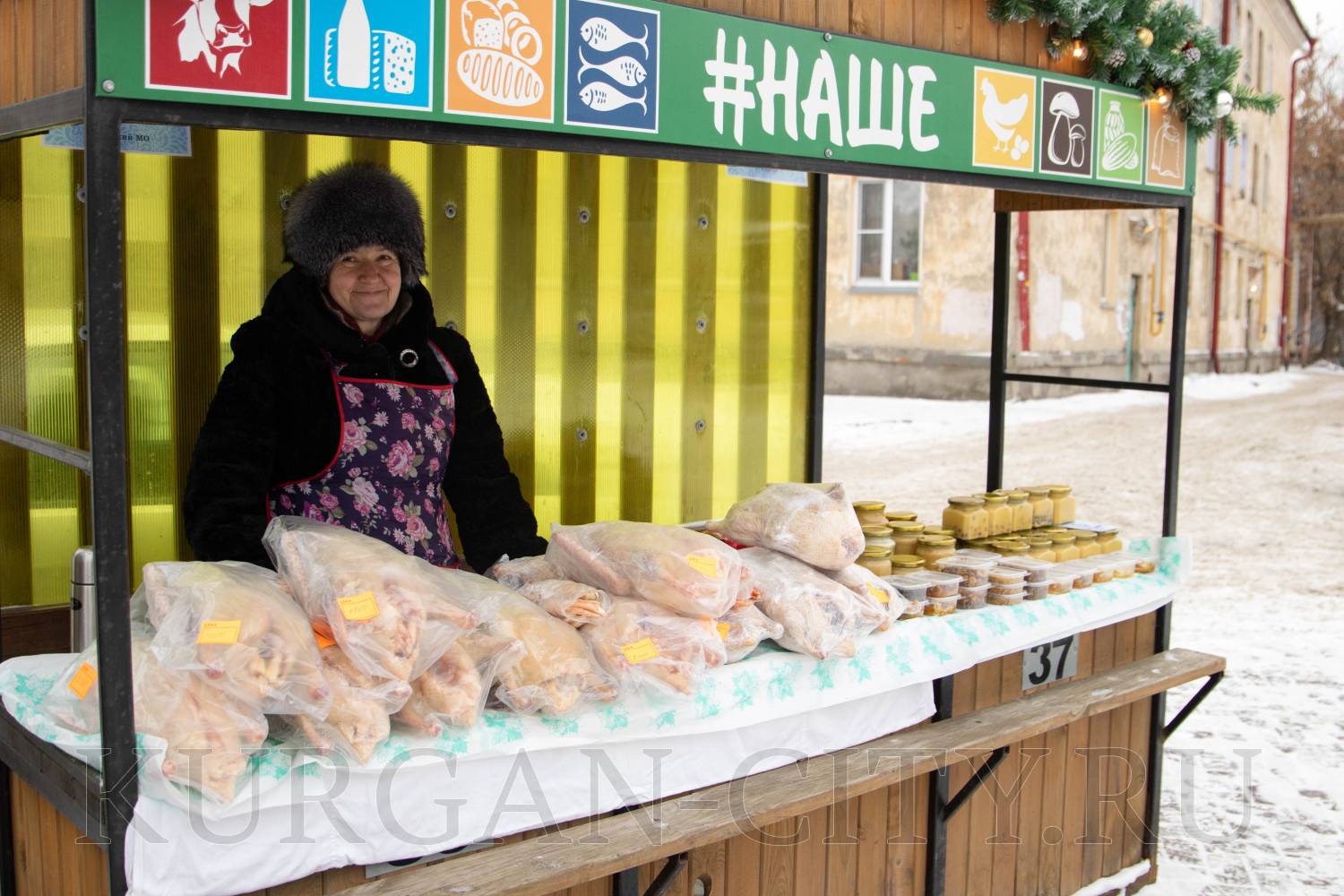 Привезли свою фермерскую продукцию предприниматели Корытовы из села Пушкино Куртамышского района. У них можно купить домашнюю тушёнку, сало солёное и грудинку копчёную, разные колбасы, разнообразную молочную продукцию.