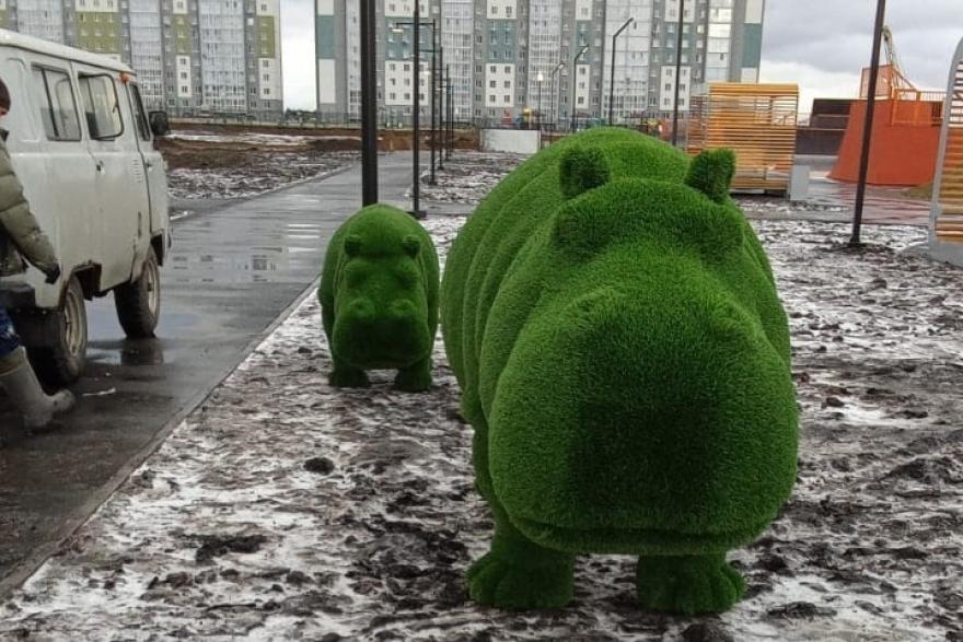 В 4-м микрорайоне Заозёрного жилого массива установили две пары новых топиариев - бегемотов и улиток.