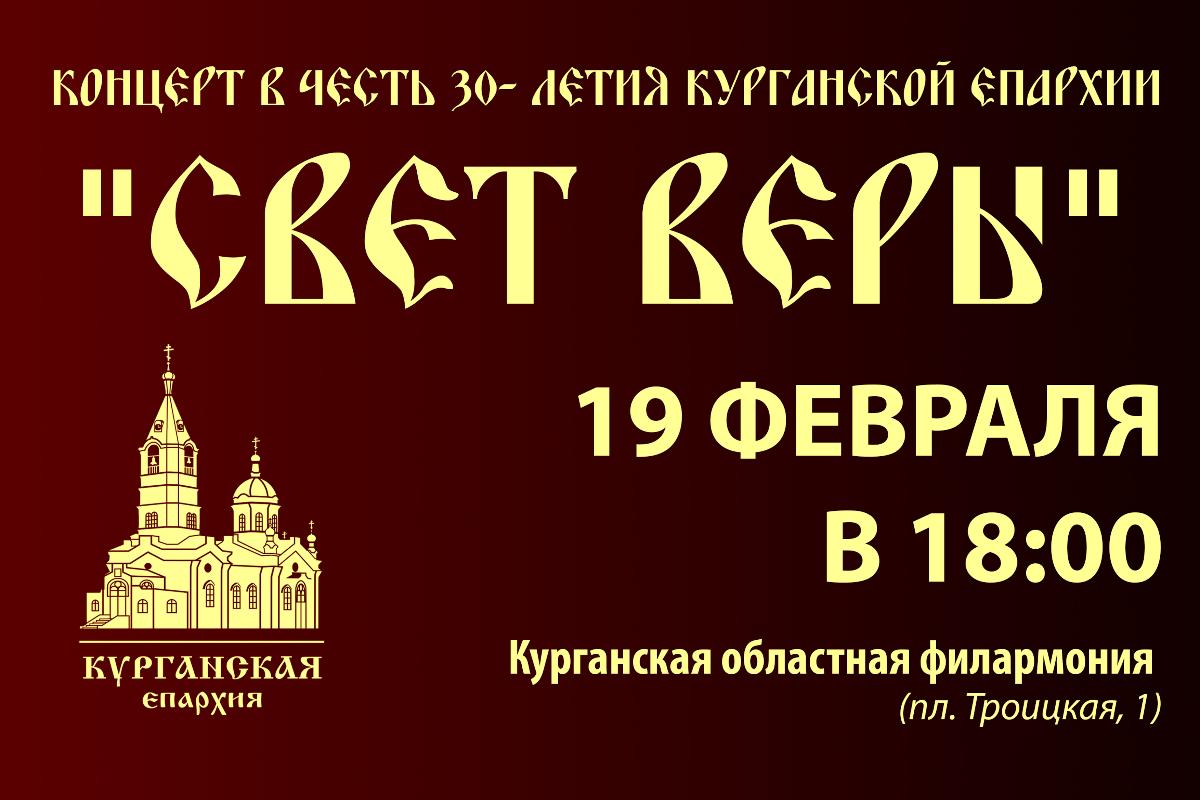 Благотворительный праздничный концерт «Свет веры» состоится 19 февраля (суббота) в 18:00 в большом зале Курганской областной филармонии.
