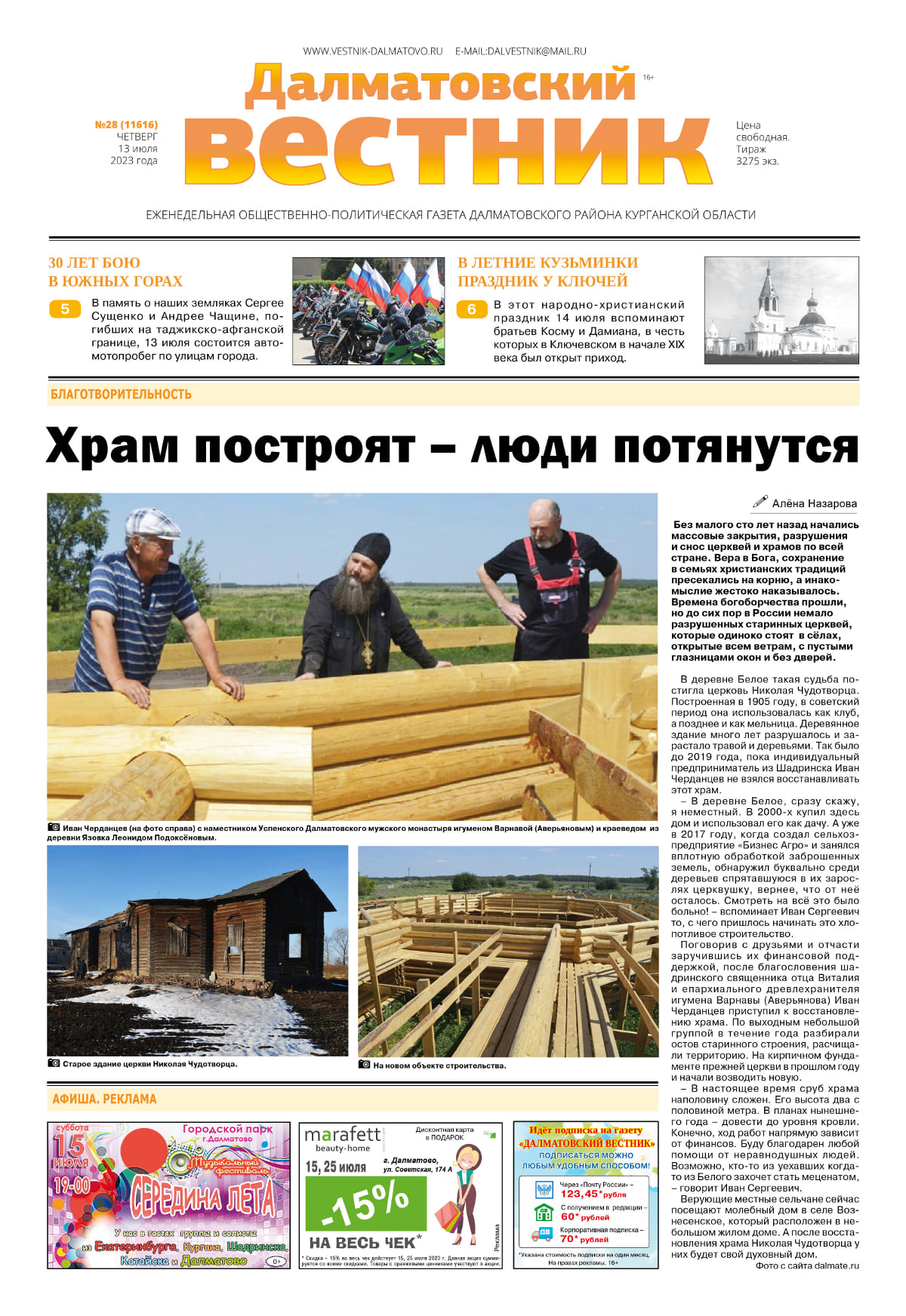 Алёна Назарова в статье «Храм построят – люди потянутся», размещённой на первой странице районной газеты «Далматовский вестник» № 28 (11616) от 13 июля 2023 г., пишет: