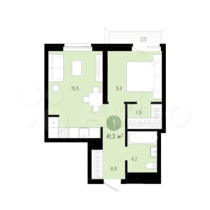 - Общая площадь: 41.3 м²