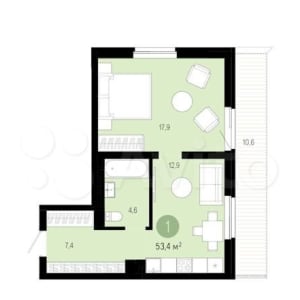 - Общая площадь: 53.4 м²